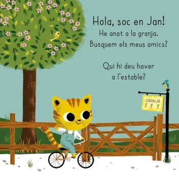 Avui en Jan és a la granja. Hi busca els seus amics a l’estable, al gallliner, al cobert... per jugar amb ells.